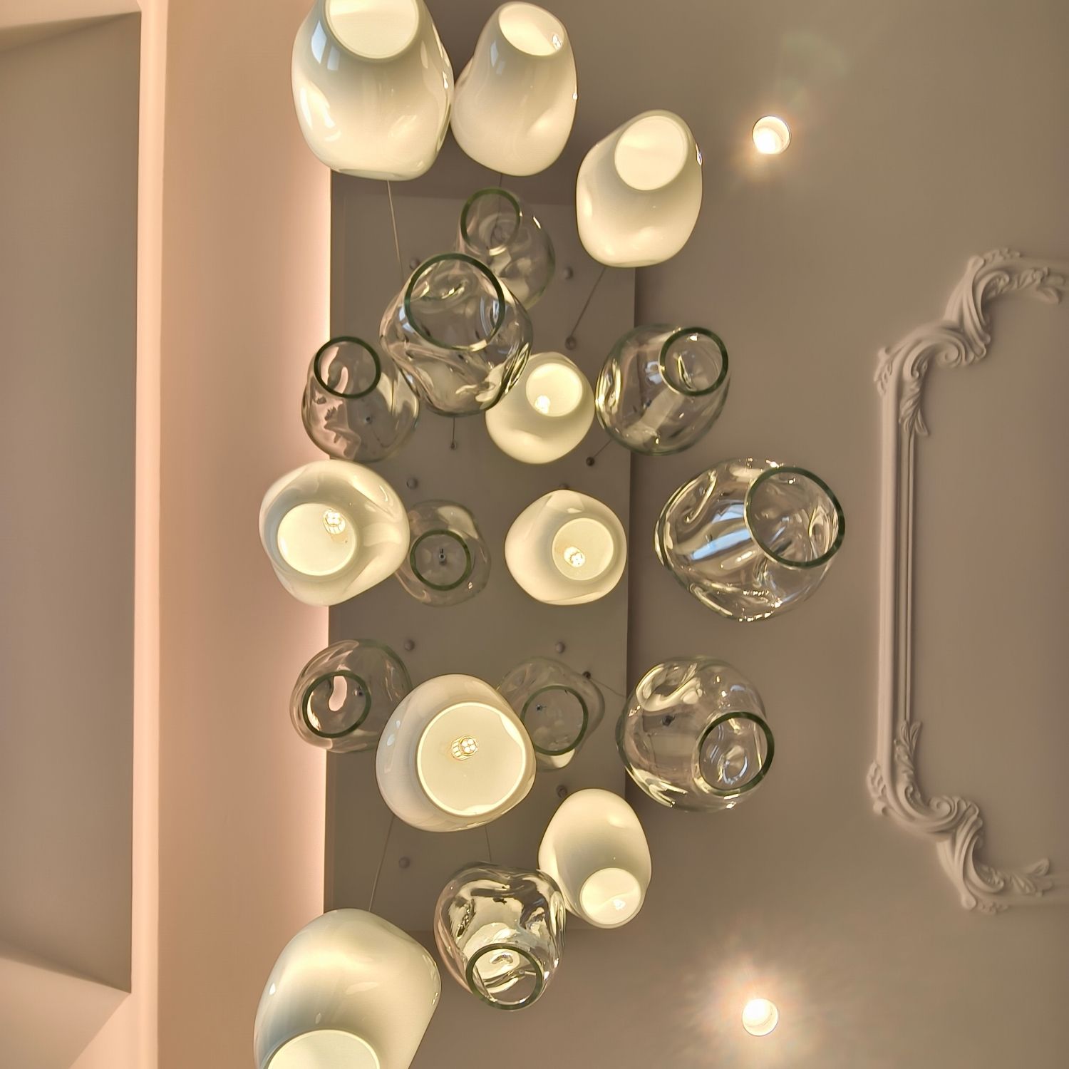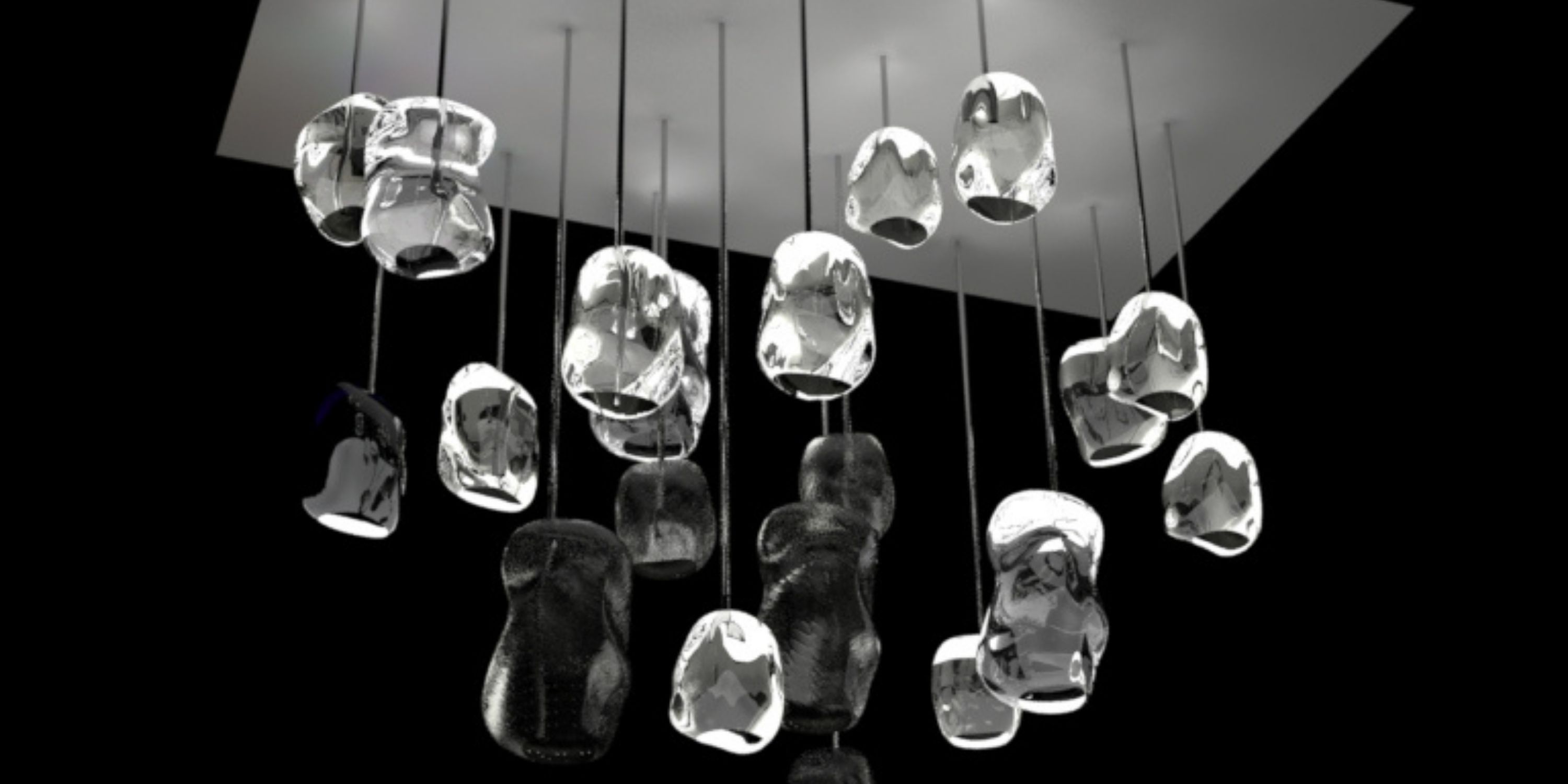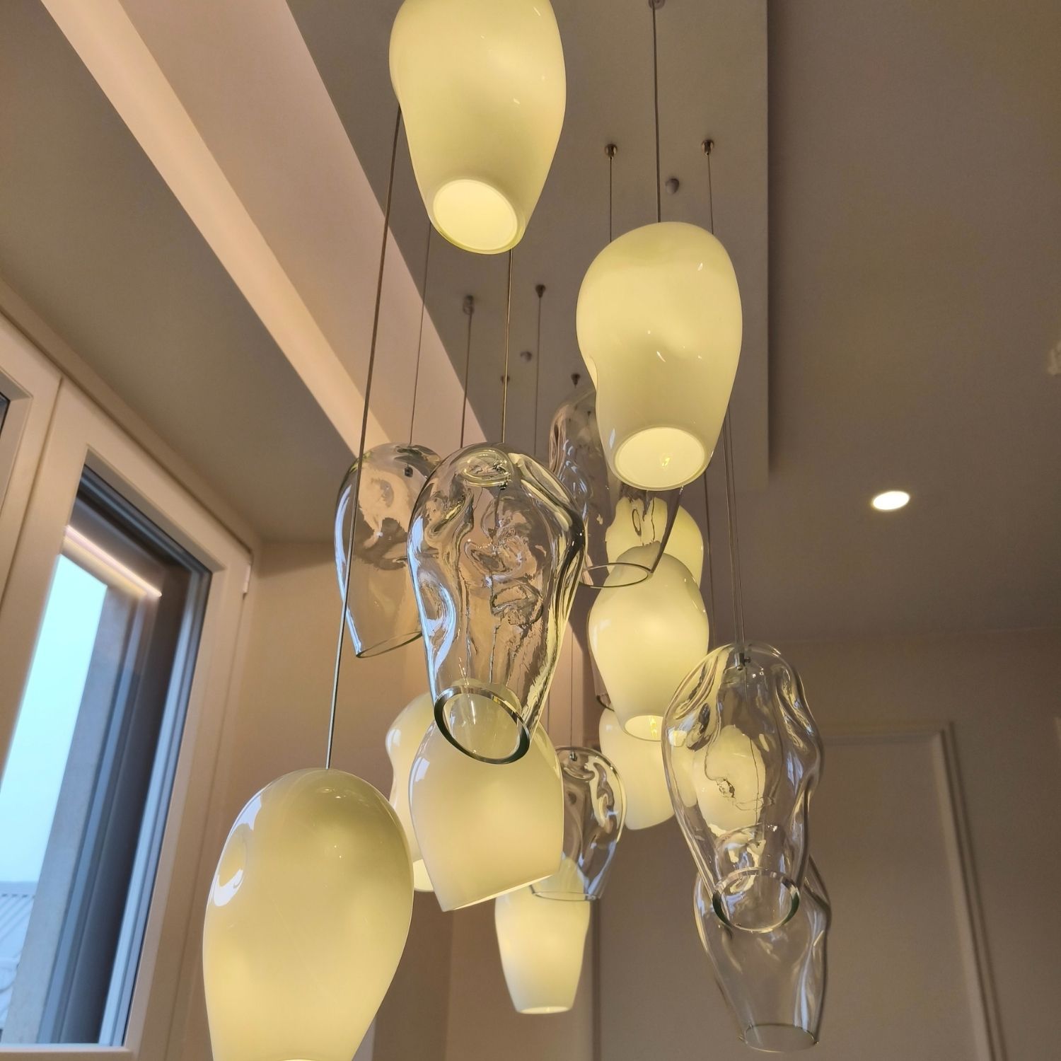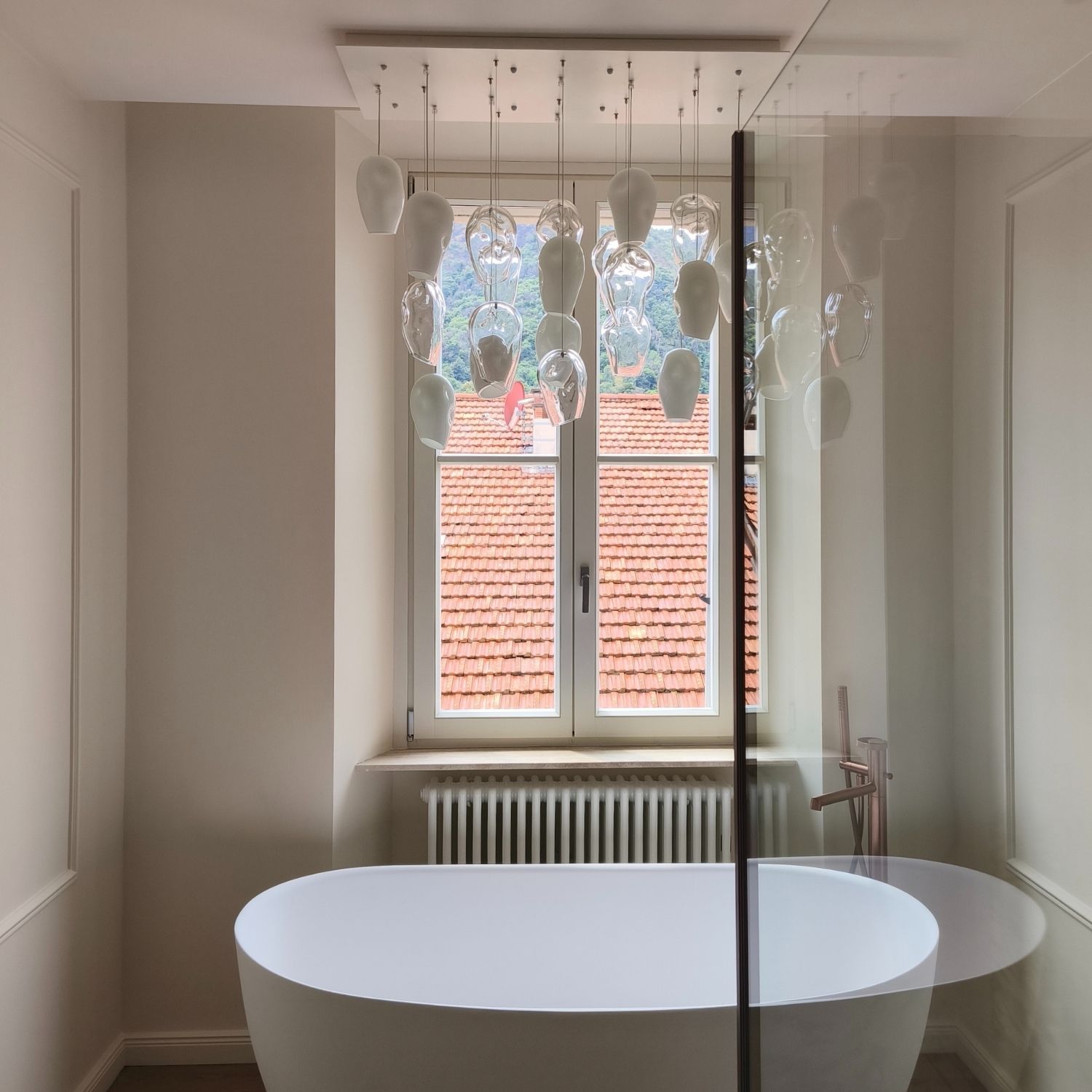 L’installation Icerock est positionnée au-dessus de la baignoire, devenant un point focal sculptural de l’espace. Des éléments en verre de Murano, cristal et blanc, réalisés entièrement à la main, sont suspendus à une rosace de plafond et disposés en colonne verticale sur des câbles en acier inoxydable.