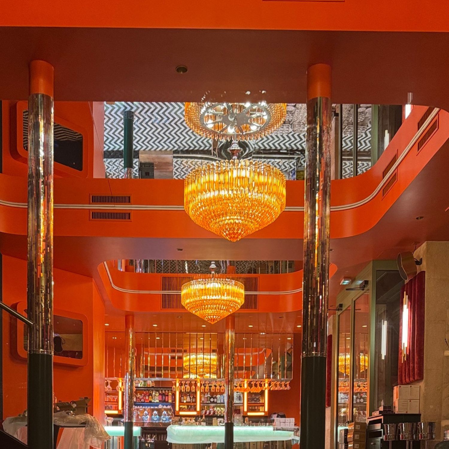 I lampadari Afrodite, realizzati in vetro quadriedro ambra con finitura in ottone satinato, si inseriscono nell'atmosfera vibrante del Café Rive Droite a Parigi. La forma ricorda uno spicchio d'arancia sospeso — un richiamo ai toni caldi dell'ambiente e all'energia di un aperitivo al tramonto.